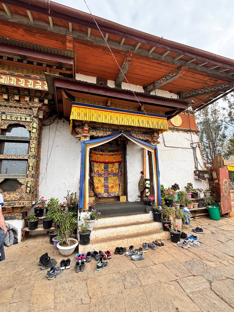 Daarna rijden we door naar Jambay Lhakhang, de oudste tempel van Bhutan. Heel leuk om al de oude mensen hun toertjes te zien lopen en ondertussen te zien bidden en de gebedsmolens draaien. Na een wandeling van 2 km, komen we aan bij Kurjey Lhakhang. Weer een imposant bouwwerk en we hebben geluk want het zonnetje schijnt, ondanks de weersvoorspellingen 😅 Vervolgens lopen we door naar Tamshing Lhakhang, een kleine tempel met eeuwenoude muurschilderingen. Helaas geen foto’s 🤷🏻♀️