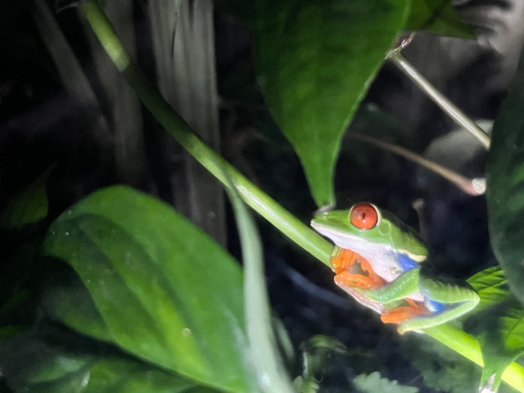 De laatste vitrine is de reden waarom ik 20 dollar betaald heb. Het Costa ricaanse simbool : de gekleurde kikker. Er zitten 4 of 5. En ze zitten redelijk kortbij. Schijn maar met het licht 😀😎