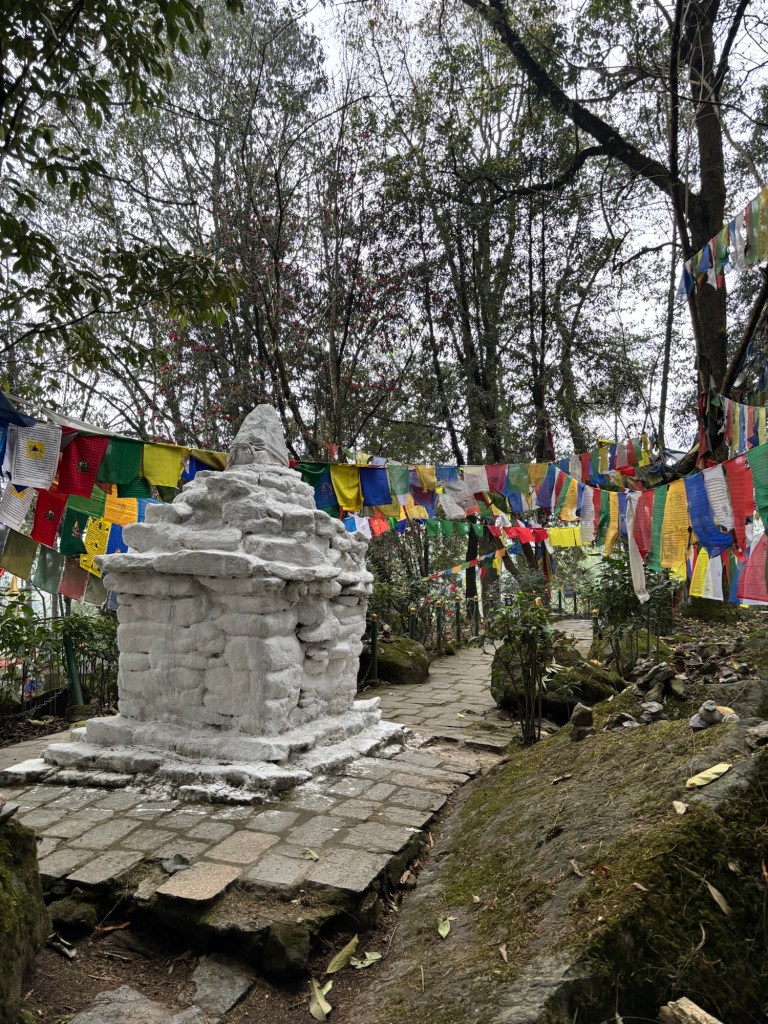 Nog even een kaarsje branden en kunnen we op weg naar Yuksom. Tegen 13.30u komen we daar aan en kunnen we kiezen uit 3 restaurantjes voor de lunch. We gaan met een aantal ergens binnen en krijgen lokale noodle soep, Thukpa 🙃 Hier ook het eerste souveniertje gekocht: de gebedsvlaggetjes… dan heb ik die toch al 😅