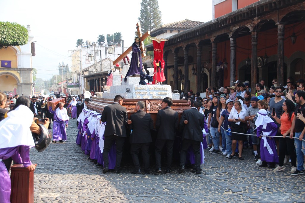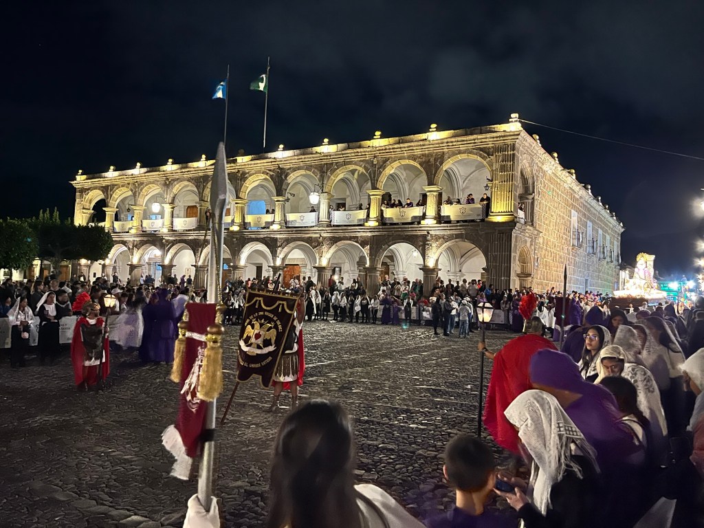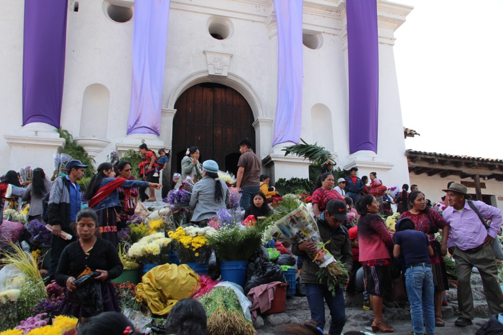 De dagen dat we in Antigua zijn, gaan we dus van de ene optocht naar de volgende. Ook al denk je dat je ze nu wel allemaal gezien hebt, toch is het elke keer anders. Dan allemaal in het Paars, dan allemaal in het zwart, alleen kinderen, alleen vrouwen. Op het grote plein, in de kleine straatjes voor het hotel… In daglicht en in het donker. Elke optocht heeft weer zijn eigen doel en sfeer. Je krijgt er geen genoeg van. En hoe dichter we bij Pasen komen, hoe groter de optochten en de bloementapijten worden.