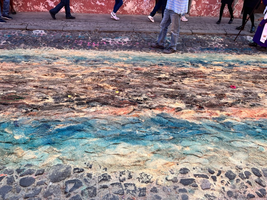 Bij het teruglopen zien we de eerste bloementapijten die zich vormen. Iedereen doet het op zijn manier, en zo groot als hij het kan betalen. Hier wordt een heel jaar voor gespaard.