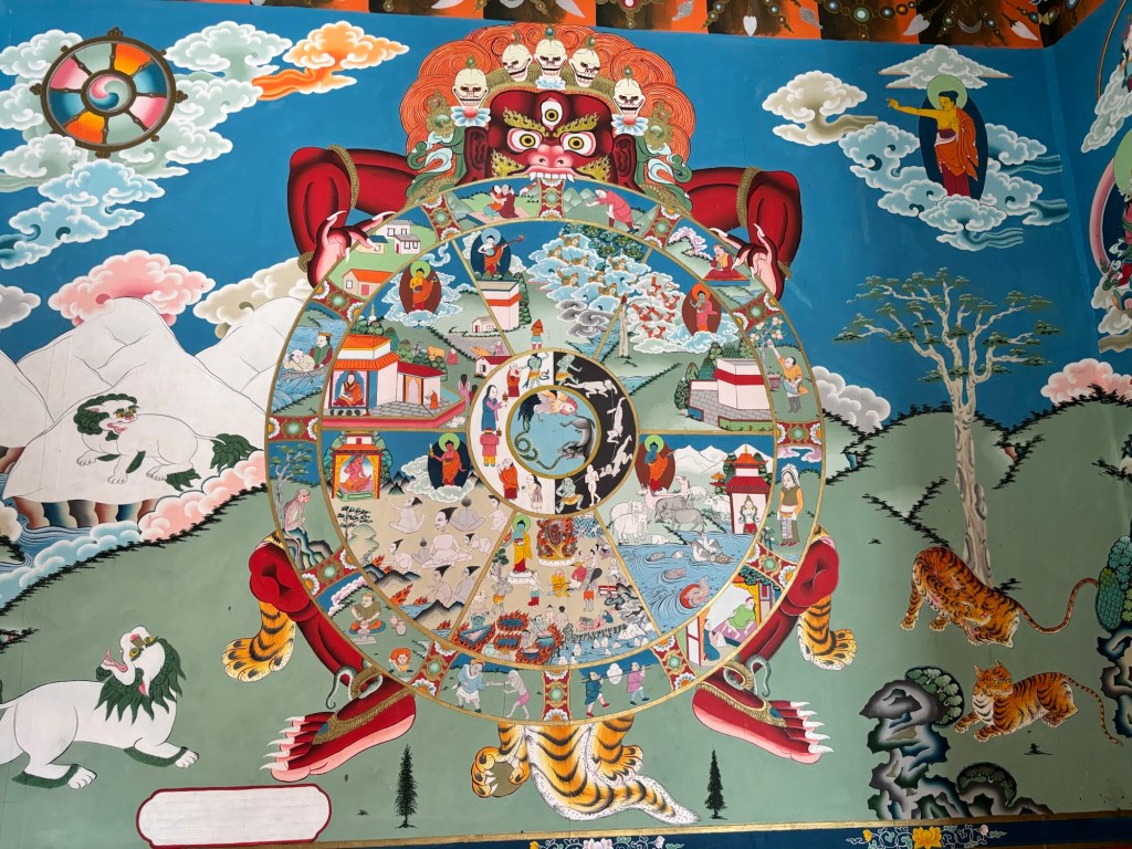 We zijn vandaag met 4 jeeps die zich een weg banen uit het drukke Gangtok. Het eerste klooster ligt 40 kilometer buiten de stad. Het is een lange tocht aan een geweldig slakken tempo. Ondanks dat we over de National Highway rijden, lijkt het net de Brusselse ring. Stapvoets verkeer. En hoe ze hier zo weinig ongevallen hebben, is me ook niet helemaal duidelijk als je ziet hoeveel plaats er soms maar over is. 😰