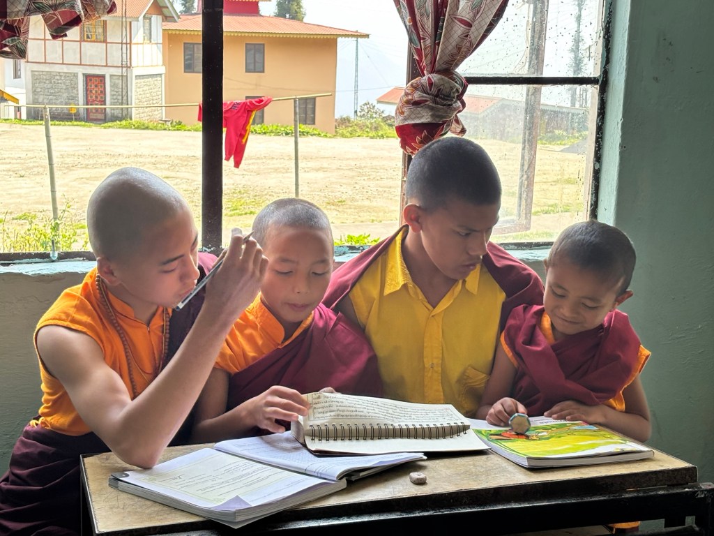 Onderweg stoppen we even aan een van de vele bruggen die we over moeten. Is een geweldig uitzicht. Je voelt je heel nietig. Vervolgens rijden we door naar een kleine waterval. Hier blijkt dat we eigenlijk al een beetje achter op schema zitten. Dus ipv ons af te jagen en na de middag weer in de stad te zijn, wordt er beslist van straks hier terug te komen en te eten en zo ons niet af te jagen. Daarvoor is het hier veel te mooi 😍 We rijden verder de bergen in naar het hoogste klooster. Val in herhaling, maar ook hier een rust en stilte. Terwijl sommigen nog wat in de tempel zijn, loop ik met Marjon en Marjan naar een gebouwtje beetje achterin. Daar zit paar leerlingen te studeren. De lerares spreekt gelukkig wat Engels. Niet altijd even evident.
